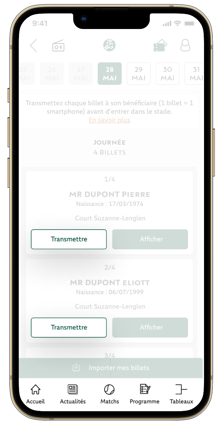 Chaque billet est contrôlé avant envoi et délivré en QR code officiel. À l’approche de votre date, vous importez le billet dans l’application Roland-Garros et accédez directement à votre siège.